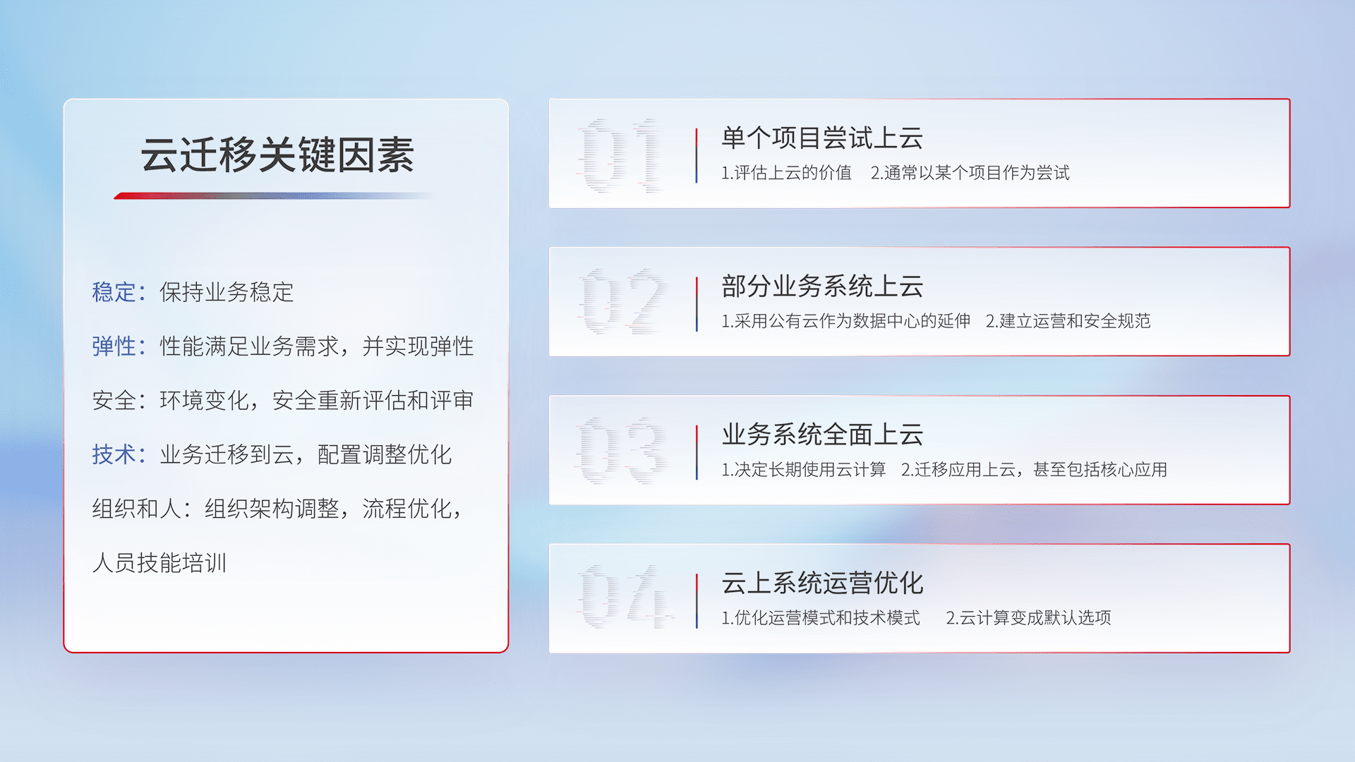 结合实际业务,,,从规划设计、、、云平台选型、、、云原生改造、、数据迁移、、、集成交付,,迁移全过程为客户识别最佳上云路径,,,做好风险识别管理,,,设计网络架构、、身份权限、、、、安全审计合规、、操作审计、、、、日志审计、、、、监控告警策略、、、、多站点容灾设计等,,对云上基础设施进行整体规划,,,,提升IT治理水平,,,,以满足弹性、、高可用、、、高性能的需求。。