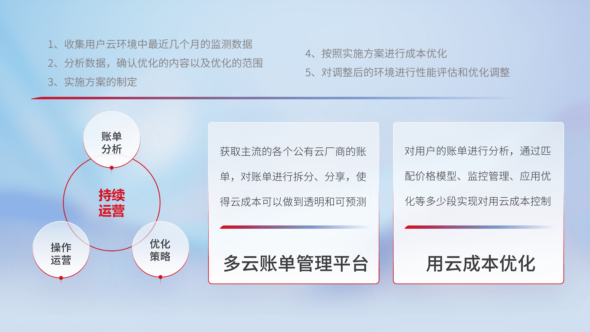 通过灵活运用多种自动化迁移工具,,帮助企业用户实现业务和数据高效 、、、、稳定的上云迁移和云上迁移,,采用自研多云纳管平台,,,以中立管理模式,,,,解决多组织、、多云、、多运维厂商的复杂关系的管理,,,,保证多云平台资源配置的一致性,,实时掌控云资源运行数据,,运用智能化工具分析云资源多云平台的管理服务,,透明化管理成本支出,,,用云成本可预测、、、、用云费用可优化、、、云资源配额有据可依。。