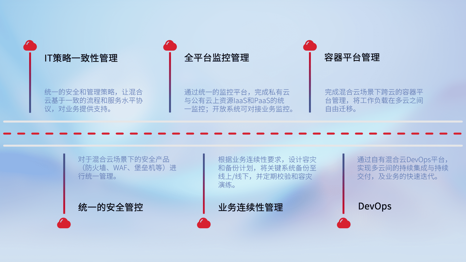 通过多云纳管,,,,以统一的资源数据模型把客户的云资源进行抽象和封装,,进而实现对多云资源的统一操作,,保障云资源管理的可靠性、、稳定性与可用性。。量身定制化运维内容,,,配置、、、开发运维、、、、补丁管理、、备份、、、监控、、、、认证和访问管理、、、、审计和日常巡检等,,保障在用云过程中的可靠度,,稳定度以及高可用率。。